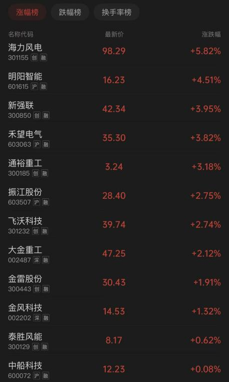 值得一提的是,今日港股風電股也集體走高,中國高速傳動漲幅超4%,報1.8港元;龍源電力漲幅超4%,報8.26港元;大唐新能源漲近1%。